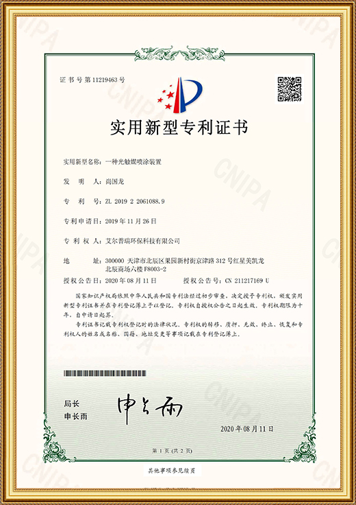 • 實(shí)用新型專利證書(一種光觸媒噴涂裝置)